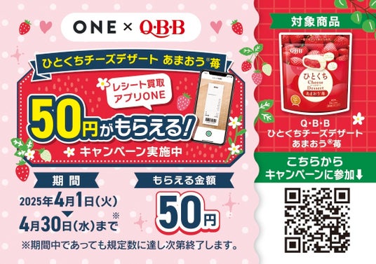 実施内容:レシート買取アプリ「ONE」で「ひとくちチーズデザート あまおう(R)苺」の購入レシートを撮影・アップロードで50~100円がもらえるキャンペーンを実施。