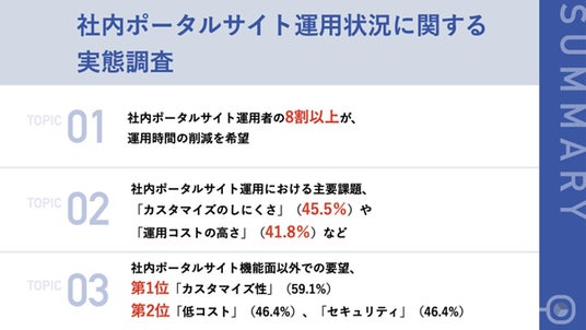 【社内ポータルサイトの運用実態を調査】担当者の8割以上が「運用時間の削減」を求める運用における主要課題、第1位は「カスタマイズのしにくさ」