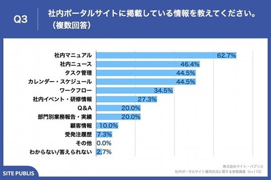 「Q3.社内ポータルサイトに掲載している情報を教えてください。(複数回答)」(n=110)と質問したところ、「社内マニュアル」が62.7%、「社内ニュース」が46.4%となりました。