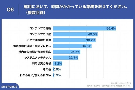 「Q6.運用において、時間がかかっている業務を教えてください。(複数回答)」(n=110)と質問したところ、「コンテンツの更新」が56.4%、「コンテンツの作成」が40.0%、「アクセス権限の管理」が38.2%という回答となりました。