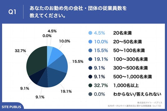 「Q1.あなたのお勤め先の会社・団体の従業員数を教えてください。」(n=110)と質問したところ、「従業員数1,000名以上」が32.7%という回答となりました。