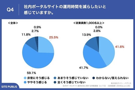 「Q4.社内ポータルサイトの運用時間を減らしたいと感じていますか。」と質問したところ、全体(n=110)は「非常にそう感じる」が25.5%、「ややそう感じる」が59.1%、従業員数1,000名以上の企業(n=36)は「非常にそう感じる」が41.6%、「ややそう感じる」が41.7%という回答となりました。