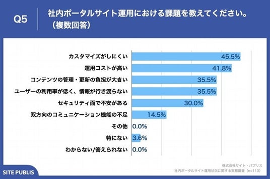 「Q5.社内ポータルサイト運用における課題を教えてください。(複数回答)」(n=110)と質問したところ、「カスタマイズがしにくい」が45.5%、「運用コストが高い」が41.8%という回答となりました。