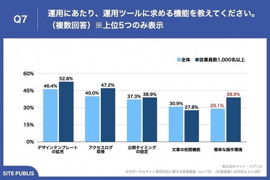 「Q7.運用にあたり、運用ツールに求める機能を教えてください。(複数回答)」と質問したところ、全体(n=110)は「デザインテンプレートの拡充」が46.4%、「アクセスログ取得」が40.0%、「公開タイミングの設定」が37.3%、従業員数1,000名以上の企業(n=36)は「簡単な操作」が38.9%で全体より9.8ポイント高い結果となりました。