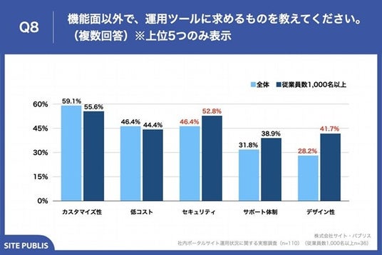 「Q8.機能面以外で、運用ツールに求めるものを教えてください。(複数回答)」と質問したところ、全体(n=110)は「カスタマイズ性」が59.1%、「低コスト」が46.4%、「セキュリティ」が46.4%、従業員数1,000名以上の企業(n=36)は「セキュリティ」が52.8%で全体に比べ6.4ポイント、「デザイン性」が41.7%で全体より13.5ポイント高い結果となりました。