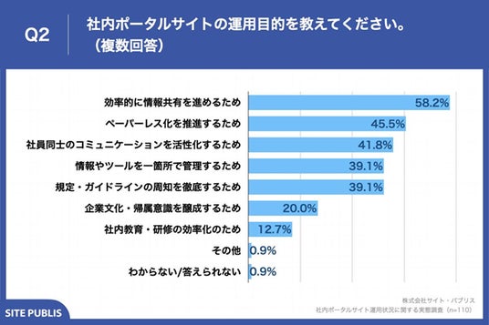 「Q2.社内ポータルサイトの運用目的を教えてください。(複数回答)」(n=110)と質問したところ、「効率的に情報共有を進めるため」が58.2%、「ペーパーレス化を推進するため」が45.5%、「社員同士のコミュニケーションを活性化するため」が41.8%という回答となりました。