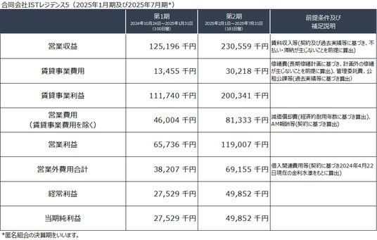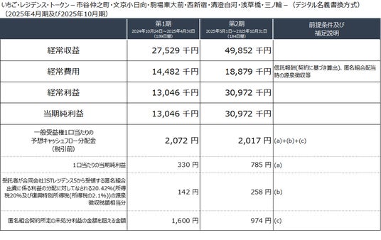 「いちご・レジデンス・トークン -市谷仲之町・文京小日向・駒場東大前・西新宿・清澄白河・浅草橋・三ノ輪-(デジタル名義書換方式)」の受益証券発行信託(以下、「本ファンド」という。)の委託者である合同会社IRS5は、本ファンドの発行者(委託者)として、2025年4月期(第1期)および2025年10月期(第2期)の業績予想(本資料公開日時点の予想)をお知らせいたします。