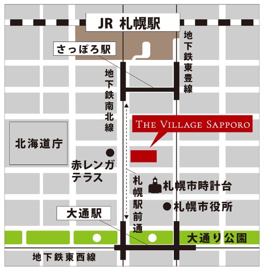 当社は、地下鉄「さっぽろ駅」徒歩2分、地下鉄「大通駅」徒歩4分、JR「札幌駅」徒歩6分というアクセスの良い好立地に新築オフィスビル「THE VILLAGE SAPPORO」の開発を進めています。(2026年4月竣工予定)THE VILLAGE SAPPOROは、チ・カ・ホ(札幌駅前通地下歩行空間)に直結しており、四季を通じて安全、快適なアクセスが可能です。