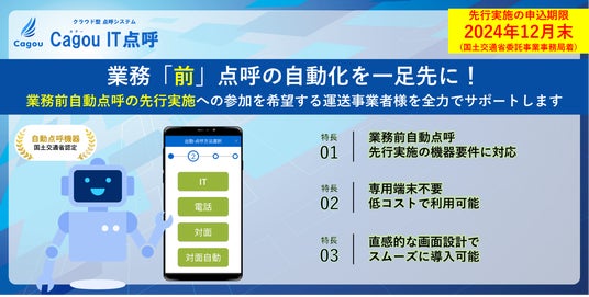 「Cagou IT点呼」は、運行管理者・運転者の業務負荷を最大限削減することをコンセプトに開発したクラウド型点呼システムです。今回、遠隔点呼、IT点呼、電話点呼、対面点呼、業務後自動点呼に加え、業務前自動点呼(先行実施要領)に対応することで、運行管理者・運転者双方の長時間労働の削減が可能となります。