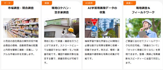 当社の写真収集プラットフォームを活用したサービスは、「必要な時に、必要な場所の、必要な写真」を効率的に収集することを可能にします。全国どこにいても、場所や撮影してほしい状況を細かく指定して写真撮影を依頼できるため、時間や場所に制約されることなく、多様なニーズに対応でき、マーケティング戦略立案のための市場調査、営業管理のための物件情報収集、観光DX推進のための地域情報データ収集など、現場の現状把握を中心とした幅広いフィールドワークを支援します。