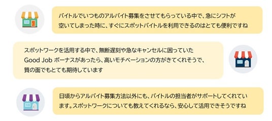「スポットバイトル」は、「Good Job ボーナス」を搭載した全く新しいスポットのバイトサービスとなり、ワーカー・事業主(企業)双方にWin-Winの関係を実現します。