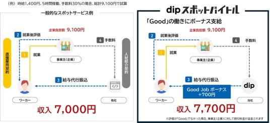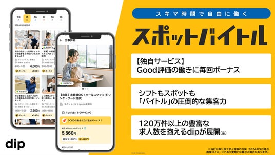 ディップ株式会社(以下「当社」)は、日本初(※1)の独自機能「Good Job ボーナス」を搭載したスポットのバイトサービス「スポットバイトル」を本日より開始いたしました。(※2)