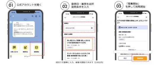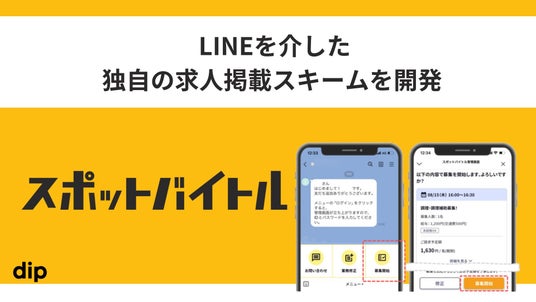ディップ株式会社(以下「当社」)は、「Good Job ボーナス」を搭載したスポットのバイトサービス「スポットバイトル」にて、LINEを介した独自の求人掲載スキーム(以下「本スキーム」)を開発いたしました。なお、本スキームは特許出願中となります。