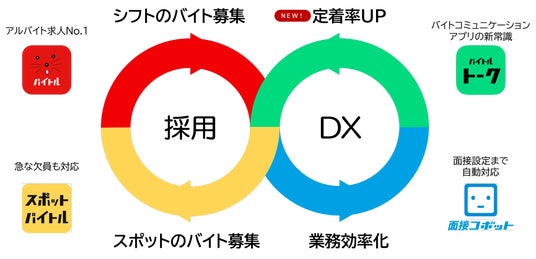 日本最大級のアルバイト・パート求人情報サイト「バイトル」を運営する当社は、ユーザーファーストというフィロソフィーに基づき、スポットワークで優良な働きをする方の待遇を引き上げていくため、日本初の独自機能「Good Job ボーナス」を搭載したスポットのバイトサービス「スポットバイトル」を本年10月より開始しました。また、人手不足や業務効率に課題を抱える業界・業種での定型業務を自動化するDXサービス「コボット」シリーズを展開しております。この度の「バイトルトーク」開始により、アルバイト従業員と店舗管理者側のコミュニケーションを改善し、労働市場における諸課題の解決につなげてまいります。