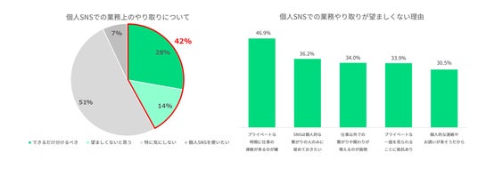 アルバイト従業員の42%が個人SNSでの業務上のコミュニケーションを問題視しており、その理由は「プライベートな時間に仕事の連絡が来ることを避けたい」「SNSは個人的なつながりにとどめておきたい」等があげられます。