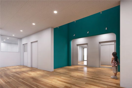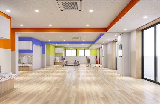 【デザインポイント】空間の特性を活かし各エリア毎に彩度の高いカラーで色分けすることで中に入った瞬間に絵本の町に飛び込んだような空間を創出します。空間ごとに異なるストーリーが展開され、各エリアで子どもたちの気持ちや行動に自然な変化を促します。保育園全体が「絵本のページのように色鮮やかに展開する家」であり、子どもたちが色に導かれながら、冒険心や好奇心、そして毎日来たくなるようなワクワク空間をめざします。