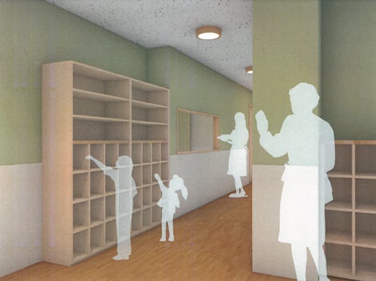 【デザインポイント】本園は緑にあふれ、木洩れ陽や風が通り抜ける並木道に開かれた空間となります。並木道は空間にリズムを生み出し様々な風景を生み出してくれます。子どものプライバシーを確保しつつ並木道の要素を取り入れたリズムある様々な居場所のある保育園です。