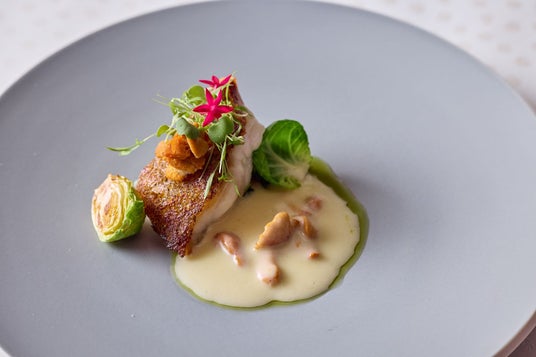 三重県産真ハタのソテー 雲丹とヴェルモットのブールブランソース 縮みほうれん草を添えて