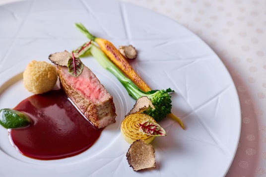 知多牛ロース肉のロティ 愛知県産レンコンのクロケット 赤ワインのソースと春菊のピュレ 黒トリュフを散りばめて
