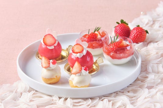 いちごの形をした、ストロベリーとルビーチョコレートのムースをはじめ、ティアラが乗ったプリンセス感溢れるいちごのヴェリーヌ、ピスタチオといちごの層が美しいオペラ、シューの食感とフレッシュないちごが相性抜群のシュークリーム、さわやかな味わいのいちごジュレとパンナコッタなど いちごづくしの中でも様々な食感・味わいが楽しめるよう、バランスよく考え抜かれたパティシエ特製の全7種のスイーツ、3種の軽食、焼き立てのスコーン2種をご堪能いただけます。