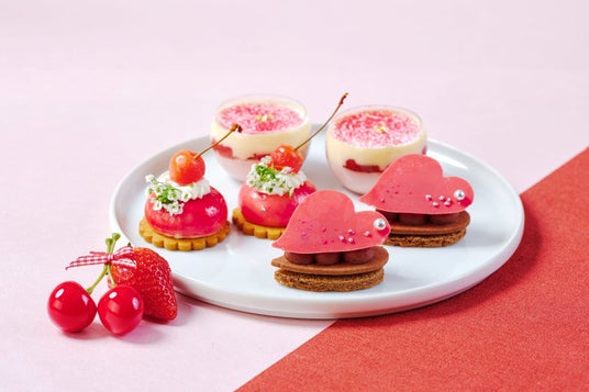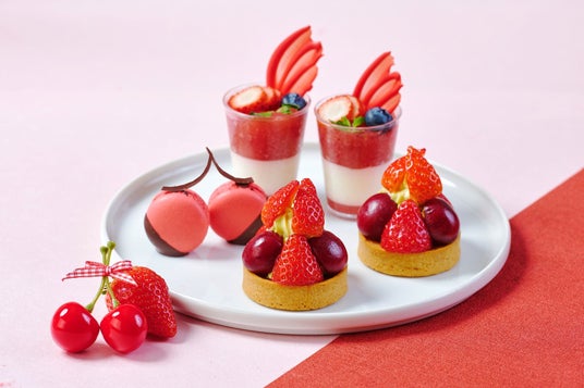 春の訪れを感じる本シーズンは、フレッシュな“いちご”と“さくらんぼ”を贅沢に使用し、“赤い2つの宝石”に見立てた煌びやかなスイーツが並びます。さっぱりとした味わいのいちごのヴェリーヌをはじめ、いちごとさくらんぼをふんだんに使用したタルトや、チョコレートとさくらんぼの層が美しいハート型のグリオットチェリーのショコラなど、一つ一つのスイーツに“いちご”と“さくらんぼ”の要素を取り入れたスイーツを用意しました。