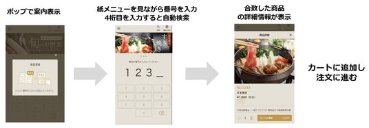 本機能の特徴は、ユーザーは備え付けのメニューブックに記載された商品番号をモバイルオーダーに入力するだけで注文が完了する点です。この機能によりタッチパネルやスマートフォンの操作に不慣れな方でも直感的に利用できる仕組みを実現しました。