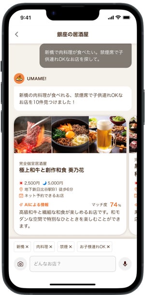 「UMAME!」は、生成AI技術やぐるなびのデータを使ってあらゆる外食ニーズにパーソナライズした店舗提案を行い、ユーザーを未知の食体験へと導く新たな飲食店探しのアプリです。従来の飲食店検索とは異なり、エリアや料理ジャンルを指定するだけでなく、日常的な会話で気分やニュアンスに基づいて検索し、ネット予約まで完結することが可能です。また、画像ファイルを使用して料理や雰囲気から飲食店を見つけることもできます。(一部機能は特許出願中)