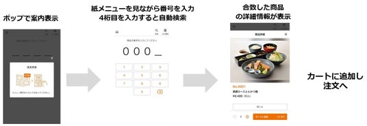 本機能は、注文の簡便性を向上させて誰でも簡単に利用できるシステムを目指して開発され、2024年12月に提供を開始しました。備え付けのメニューブックに記載された商品番号をモバイルオーダーに入力するだけで注文が完了する仕組みで、タッチパネルやスマートフォンの操作に不慣れな高齢者や訪日外国人も直感的に利用できる点が特徴です。