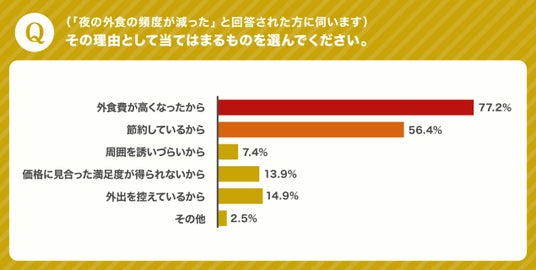 夜の外食の頻度を尋ねたところ、「減った」と答えた人は33.7%にのぼりました。その理由として最も多かったのは「外食が高く感じるようになった」(70.6%)で、物価上昇により節約志向の高まりが見られるなかで、外食の頻度そのものに影響が出ている様子がうかがえます。