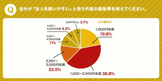 さらに、「友人を誘いやすい」と思う価格帯については、また、「誘いやすい価格帯」としては「1,000円未満」が19.8%、「1,000~2,000円」が38.8%、「2,001~3,000円」が22.5%、「3,000円未満」が合計で81.1%に達しました。このことから、相手に負担を感じさせない価格帯の明確さこそが、外食における人間関係を円滑に保つポイントになっていると考えられます。