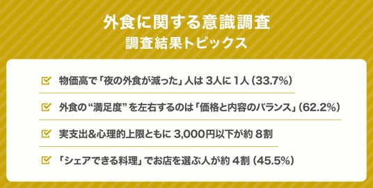”ちょうどいい外食価格”は3,000円以下が8割!物価高で「夜の外食が減った」人は3人に1人“満足できる外食”に求める基準とは?