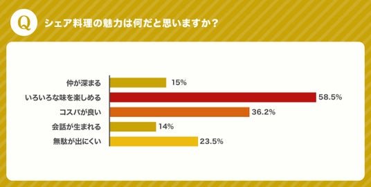 人と一緒に食事を楽しむ場面では、“どんな料理があるか”もお店選びの重要なポイントになります。今回の調査では、「シェアできる料理があるお店を選ぶことがある」と回答した人は45.5%にのぼりました。その理由としては、「いろいろな味を楽しめるから」が58.5%で最多となり、「コスパが良いから」(36.2%)、「無駄が出にくいから」(23.5%)と続きました。注文時の選択肢を広げられることや、費用対効果の高さなどが、シェアメニューを選ぶ動機になっていることがうかがえます。