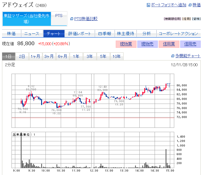 アドウェイズは夢のある銘柄ですね。連続S高もありましたし、このまま終わるとも思えないかな? 木曜日315000円で買って、金曜日にS高で売りました。 チャンスがあればまた手を出そうと思いますが深追いはしません。株はここだけじゃありませんからね。 今はオークファンに期待しています。まずは目指せ200万!! -