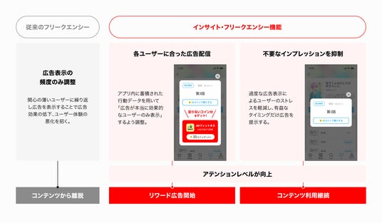 今回新装したプッシュリワードの「インサイト・フリークエンシー機能」は、広告を配信する回数を制限するだけでなく、独自のアルゴリズムを活用して、対象ユーザーの興味・関心に合った広告を配信することが可能となります。不要なインプレッションを削減し、広告を目にしたユーザーのアテンションレベル向上を実現できるため、ユーザー体験の向上や広告収益の最大化につながります。
