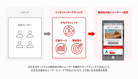 AppDriverの新機能「インサイトターゲティング」は、独自のアンケート機能やビッグデータを用いて、ユーザーの行動データや興味・関心を分析します。広告主のサービスと親和性の高いユーザーを精密にターゲティングすることで、適切なユーザーにリーチできるようになり、より高い広告効果を実現できます。