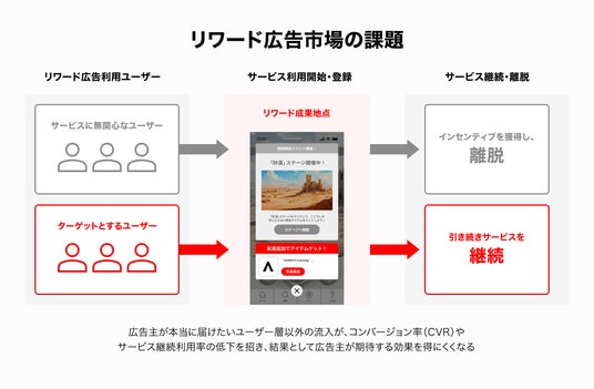 従来のリワード広告は、その特性上「特典の獲得」を主目的とするユーザーが多く流入する傾向にあります。そのため、広告主が展開する商品・サービスへの関心が薄いユーザーや、想定ターゲット層とは異なるユーザー、インセンティブを獲得後すぐに離脱してしまうユーザーなどが含まれやすく、獲得したユーザーの質が担保されにくいという課題が顕在化しています。