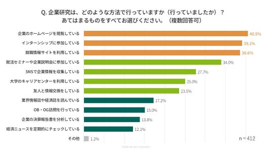 また、前問で「特定企業の企業研究を積極的に行っている・ある程度行っている」と回答した方に、その方法について聞いたところ(n=412)、「企業のホームページを閲覧している」が40.5%で最多となりました。次いで、「インターンシップに参加している」が39.1%、「就職情報サイトを利用している」が38.6%と続きました。企業の決算報告書の分析等、踏み込んだ情報収集はできていない状況が明らかになりました。