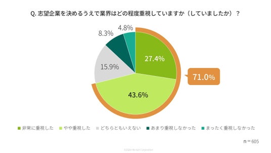 志望企業を決めるうえで、業界はどの程度重視しているか(していたか)聞いたところ(n=605)、「非常に重視した」が27.4%、「やや重視した」が43.6%となりました。合算すると、71.0%が就職活動を行ううえで業界を重視していることが分かりました。