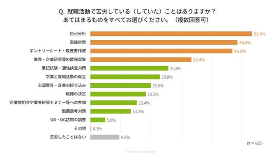 就職活動で苦労している(していた)ことを聞いたところ(n=605)、「自己分析」が53.4%で最多となりました。「業界・企業研究等の情報収集」は33.4%で、就職活動において重要度は高いものの、必要な情報収集や整理に課題を感じている学生が多いことが分かりました。