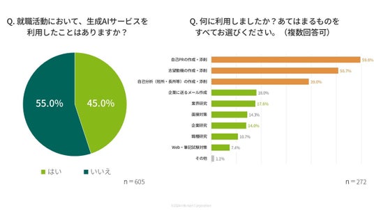 就職活動で生成AIサービスを利用したことがあるか聞いたところ(n=605)、「はい」が45.0%、「いいえ」が55.0%となりました。