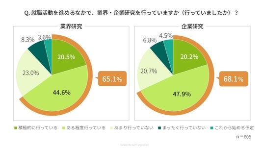 就職活動で業界研究や特定企業の企業研究を行っているか(行っていたか)聞いたところ(n=605)、業界研究は、「積極的に行っている」が20.5%、「ある程度行っている」が44.6%となり、合算すると65.1%が業界研究を行っていることが分かりました。