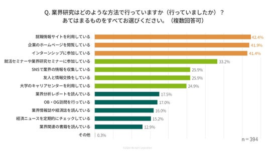 また、前問で「業界研究を積極的に行っている・ある程度行っている」と回答した方に、その方法について聞いたところ(n=394)、「就活情報サイトを利用している」が42.4%で最多となりました。次いで、「企業のホームページを閲覧している」が41.9%、「インターンシップに参加している」が41.4%と続きました。