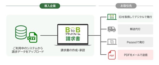 また、請求書を発行する企業は、従来の「BtoBプラットフォーム 請求書」による発行方法(デジタル・郵送・Peppolネットワークでのデジタルインボイス経由(※1))に加えてPDF発行が可能になったことで、「BtoBプラットフォーム 請求書」で全てのお取引先様へ請求書を発行できるようになります。