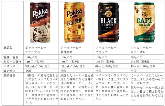 「ポッカコーヒーオリジナル」「ポッカコーヒー厳選微糖」は、定評のある味わいはそのままに、時代の流れとともに変化を遂げてきたパッケージデザインを、癒しにつながるやわらかい印象に刷新します。また、「ポッカコーヒーブラック」は酸味と苦味のバランスがとれた味わいに、「ポッカコーヒーカフェオレ」はミルクのコクにこだわった味わいに中身を改良すると共に、同じくやわらかい印象が伝わるパッケージとなります。