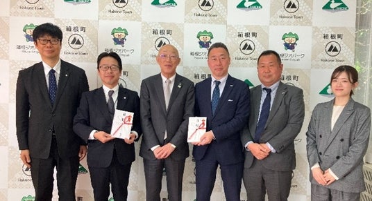 (左から:サッポロビール(株)首都圏本部 横浜支社 副支社長 田中 肇、サッポロビール(株)首都圏本部 本部長 安達 弘幸、箱根町町長 勝俣 浩行様、ポッカサッポロフード&ビバレッジ(株)首都圏営業本部 横浜支店 支店長 服部 貴志、首都圏営業本部 横浜支店 高木 一幸、ブランドマネジメント部 宣伝・販促グループ 妹尾 宏美)