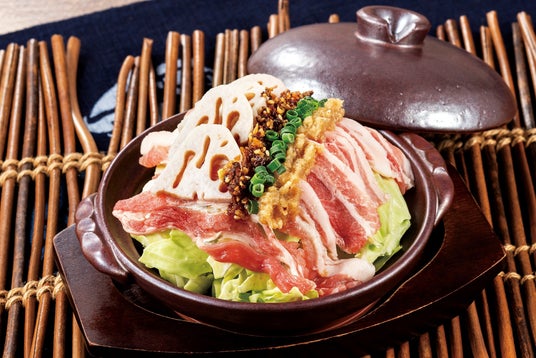 ジューシーな口溶けとあっさりとした後味の「阿波美豚」を、徳島特産「コウノトリれんこん」と春キャベツと一緒に陶板蒸しにしました。生姜醤香るソースが阿波美豚の脂の甘みによく合います。