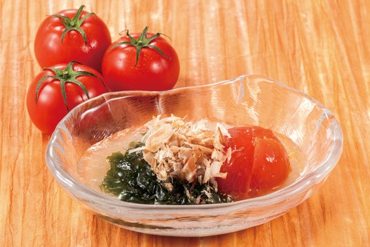 徳島県小松島市にある「樫山農園」で作られる高糖度フルーツトマト「ももりこ」と、肉厚で豊かな風味の「鳴門わかめ」をお浸しにしました。