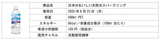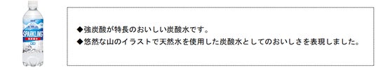 「日本のおいしい天然水スパークリング」は、強炭酸が特長であり、パッケージには、悠然な山のイラストをあしらい、天然水を使用した炭酸水としてのおいしさを表現するとともに、冷涼感を感じさせるデザインで、炭酸の爽快さを訴求しています。また、当社自動販売機で展開中の、生活に寄り添った価格でお届けする「ハートプライス」商品シリーズの対象商品です。