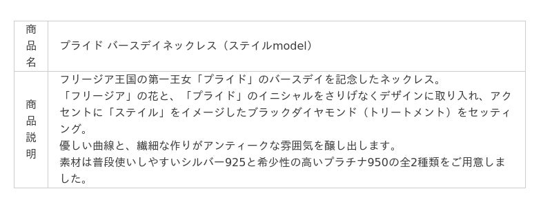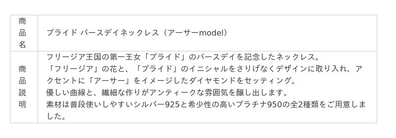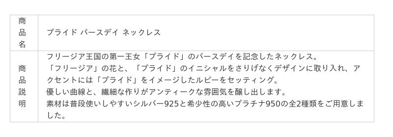 このたびの新作は主人公でフリージア王国の第一王女「プライド」のバースデイを記念したネックレスです。「フリージア」の花と、「プライド」のイニシャルをさりげなくデザインに取り入れ、アクセントに天然石をセッティングしました。