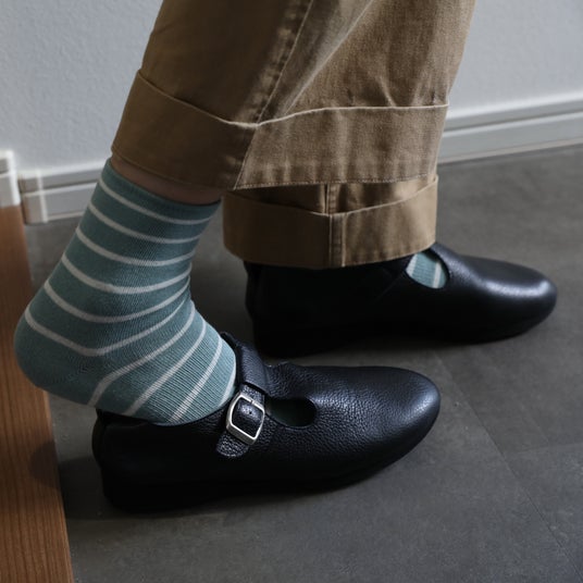 土踏まずから足の甲をぐるっと包むコムサポートゴムが、立ち仕事や移動の多い一日をそっと支えます。医療用ほど強くはないので、程良い安心感を与えてくれるはき心地です。